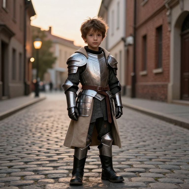 Photograph of a young boy with tousled brown hair, wearing medieval silver armor and standing on a cobblestone street at sunset in a historic town