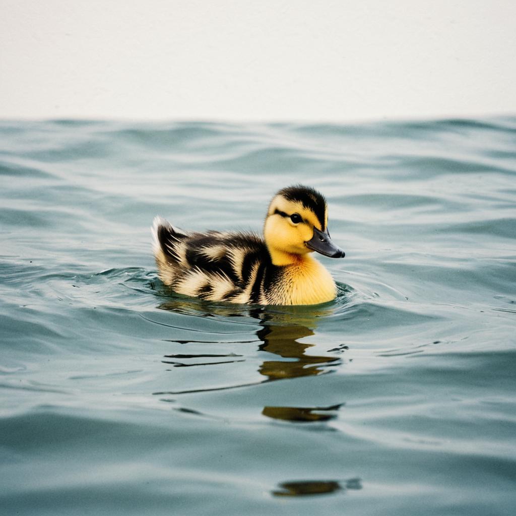 Artwork inspired by the style of Gemma Correll, featuring an eager duckling learning to swim, cute and spirited, simplistic yet expressive with a focus on humor and personality