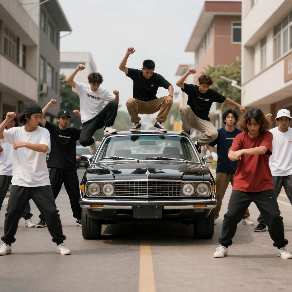 Photograph of two people dancing outdoors. The person in front has long brown hair, wears sunglasses, a beige shirt, plaid shorts, red socks, and black sneakers, striking a dynamic pose with arms raised. The person behind has curly hair, wears a white shirt and purple pants, smiling and dancing. Background includes blurred greenery and people.