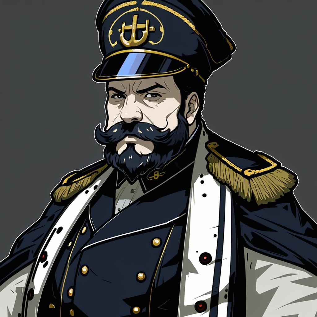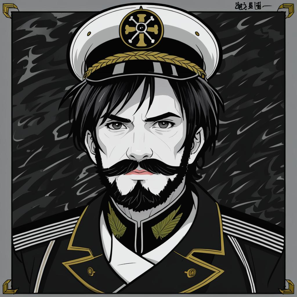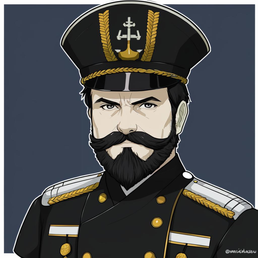 Admiral suwabe, kantai collection, 1boy, pale skin, mustache, beard, sweatdrop, black hair, sweat, naval uniform, hat, naval uniform, goatee, by artist yoshioka yoshiko, anime
