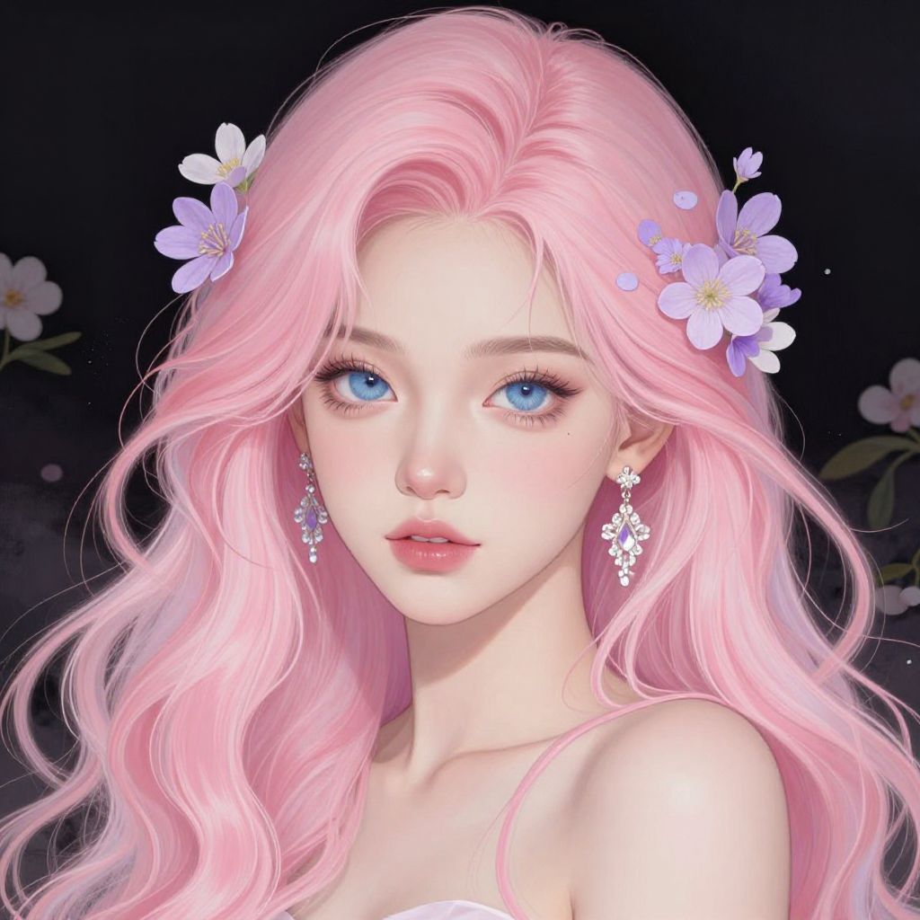 A digital artwork depicting a young woman with long, flowing pink hair adorned with delicate purple flowers. The image highlights her striking blue eyes, luminous skin, and elegant earrings, set against a dark background with scattered floral elements, blending realism with stylized digital painting techniques.