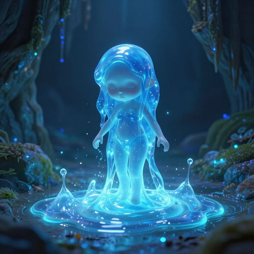 A digital CGI artwork depicts a translucent, glowing blue humanoid figure standing in a shallow, illuminated pool of water. The figure has a childlike form with a blank, featureless face, and long, flowing hair that cascades down its back. The blue light emanates from the figure, creating a radiant aura and casting reflections on the water's surface. The background is a dark, mystical forest with twisted trees and glowing fireflies, adding an ethereal atmosphere. The scene is illuminated by the blue light, highlighting the forest's textures and details. The water ripples around the figure's base, adding a dynamic element to the serene and otherworldly setting.