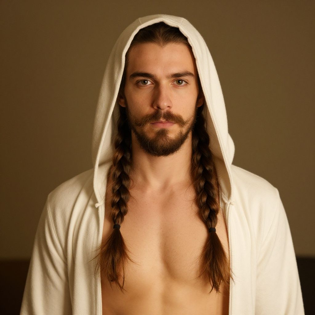 "man cave man costume, 1boy, male focus, solo, facial hair, braid, beard, hood, long hair, mustache, looking at viewer Realistic photo of casual sexy person with pretty face"