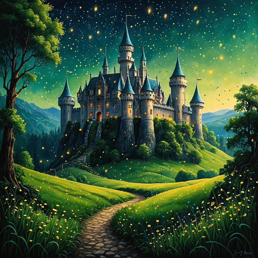 A detailed fantasy painting of a stone castle with multiple spires and illuminated windows, surrounded by glowing orange and blue mushrooms and twisted vines under a moonlit sky. The scene features a whimsical fairytale landscape with a cobblestone path leading to the castle entrance, framed by mystical vegetation.