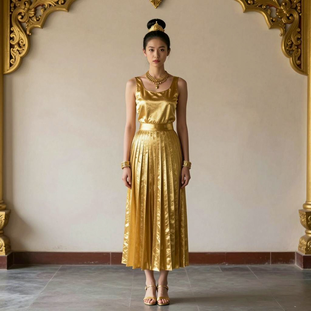 Gold skirt costume, photograph of Asian woman, standing in ornate, golden room, wearing gold pleated dress, sleeveless, gold sandals, bun hairstyle, gold headpiece, necklace, bracelets, serious expression, soft natural light, detailed wallpaper, traditional Asian architecture, center frame, full body, neutral background, elegant, minimalistic, high fashion, sophisticated