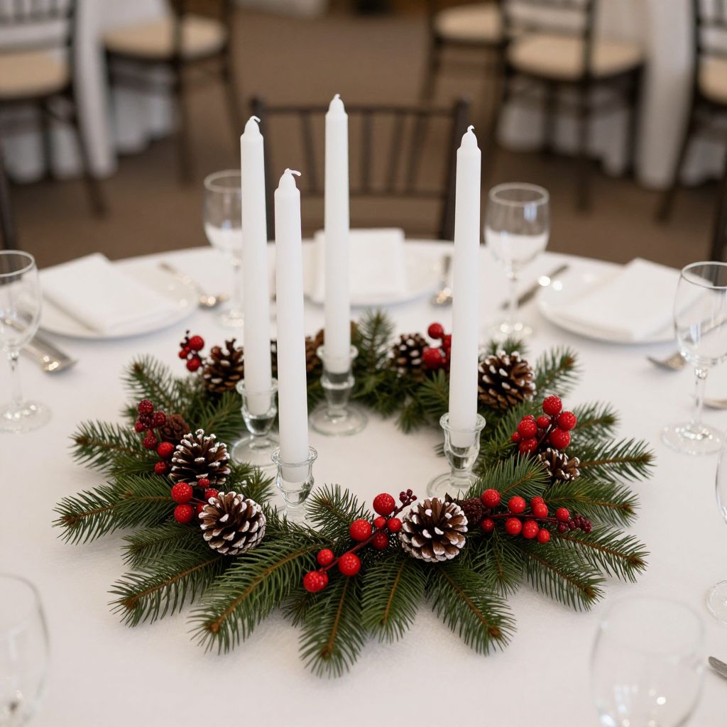 Chic winter-themed wedding centerpiece featuring four tall white candles in clear glass holders, surrounded by a lush green pine garland adorned with red berries and white pinecones, set atop a white tablecloth with elegant wine glasses and silverware arranged symmetrically around it.