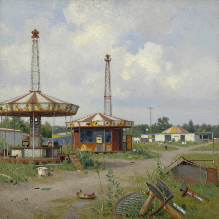 Sequence The deserted carnival grounds were overgrown with weeds, and the rides stood rusted and broken.oil painting, painted by richard schmid,