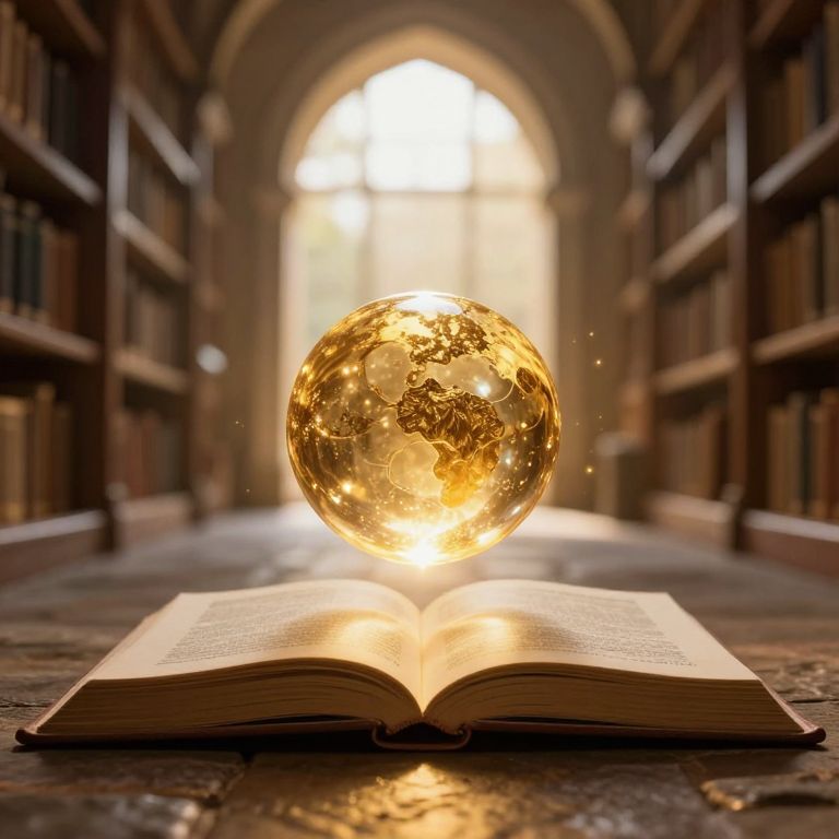 Photograph of a library aisle with tall, wooden bookshelves on both sides. In the center foreground, an open book with yellowed pages rests on a stone floor. A glowing, golden orb, resembling a transparent globe with illuminated continents, hovers above the book. Soft sunlight streams through an arched window in the background, casting a warm, ethereal glow over the scene. The orb emits small, sparkling particles, enhancing the magical atmosphere. The image combines elements of realism with a touch of fantasy.