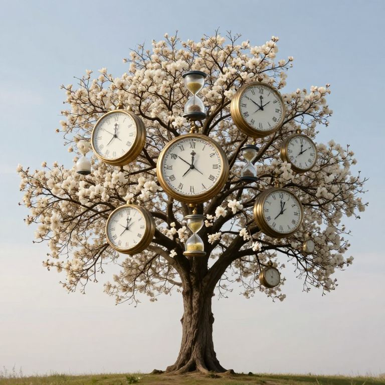 An enigmatic tree adorned with clocks and hourglasses blooms against a serene backdrop, symbolizing the paradoxical dance of time—where moments stretch, contract, and reverse, evoking a profound sense of wonder and existential contemplation.