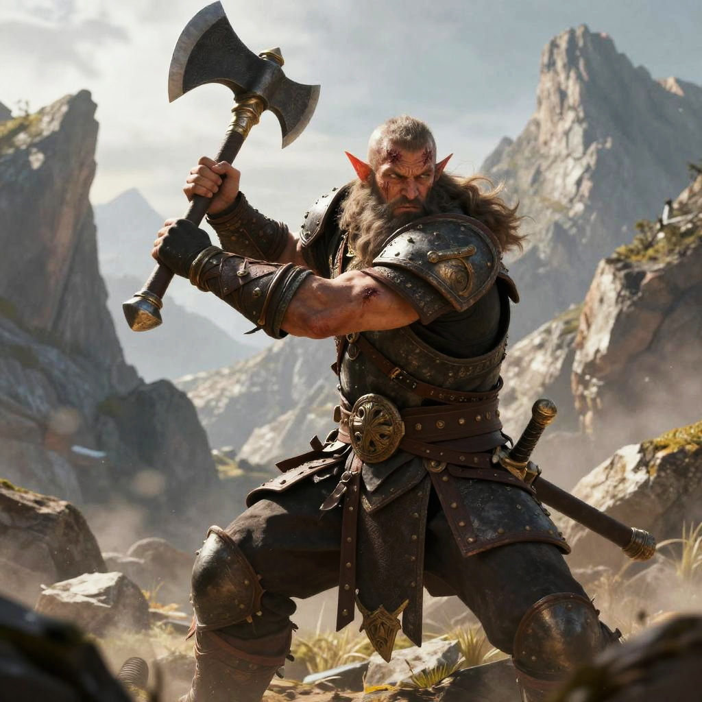 DND character art AI generator depicting a fierce dwarf barbarian raising an axe in battle stance, rugged mountainous backdrop, battle scars on face, heavy armor, dynamic pose, intense expression, hyper-realistic fantasy artwork.