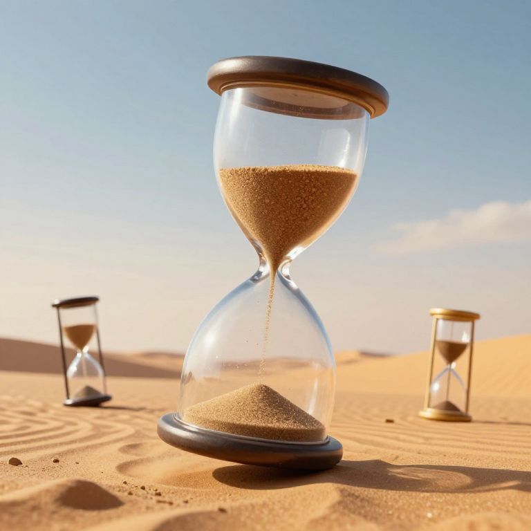 Sand-filled hourglasses hover weightlessly above a golden desert landscape, their grains suspended mid-flow as they float among a scattering of identical timepieces against a serene, gradient sky.