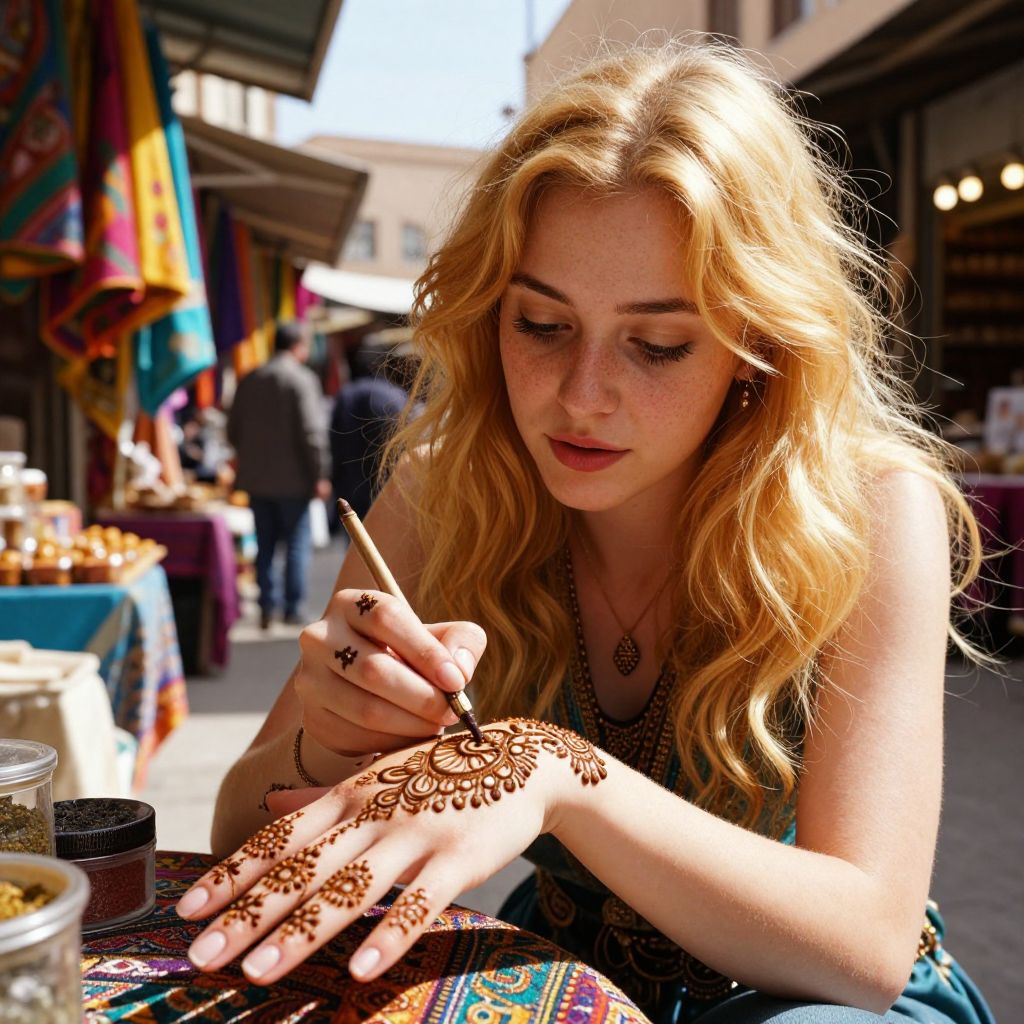 A hyperrealistic digital artwork portrays an enchanting moment as a young woman with radiant golden hair and a delicate freckled complexion delicately applies an intricate henna design to her palm in the vibrant backdrop of a bustling Moroccan market. From a low-angle viewpoint, we see her focused expression as she skillfully traces the elaborate patterns, evoking a sense of cultural pride and personal connection. The warm sunlight casts dramatic shadows across the lively scene, with colorful fabrics and aromatic spices filling the air, creating an emotional gradient that blends between tradition and modernity.