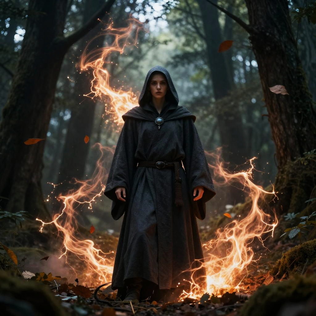 Realistic photo.sorcerer standing in a mystical forest clearing surrounded by crackling energy and swirling leaves, immense detail, cinematic lighting, HD. realistic photo