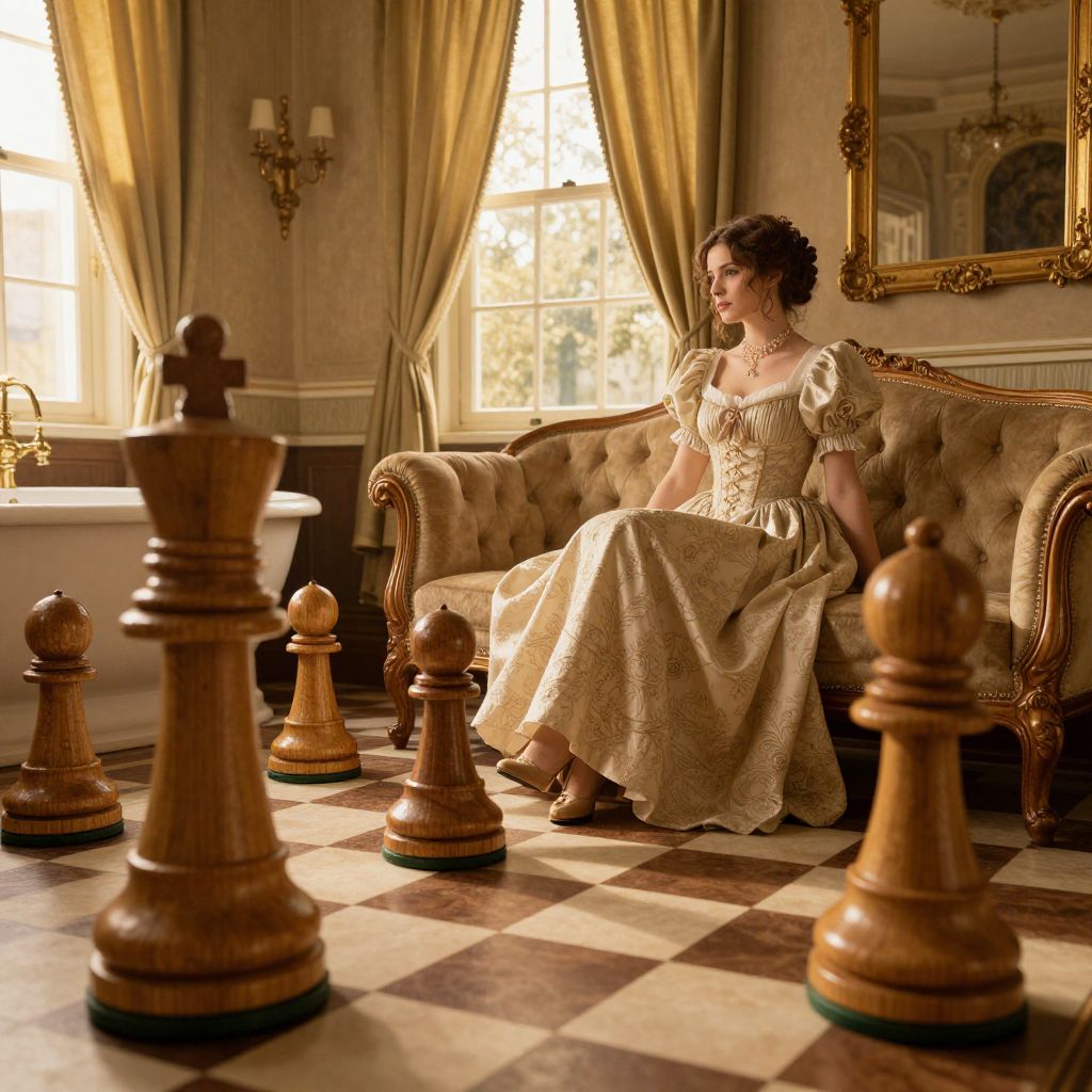 In a Victorian-era parlor bathed in golden-hour lighting, a surreal tableau unfolds as oversized wooden chess pieces stand poised on a checkered floor, while a woman in a flowing dress sits serenely on a tufted sofa, evoking a dreamlike, computer-generated ambiance where reality blurs into fantasy.
