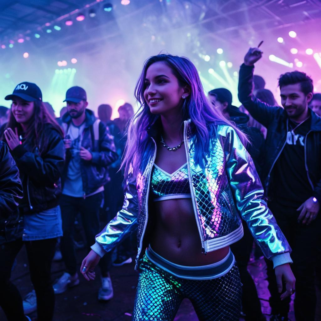 A cute mermaid wearing iridescent silver jacket dancing at a rave party, dvr-lthr, neonpunk, lofi, npai, blacklight, PENeonUV, volumetric lighting, fog, backlit, neon colors