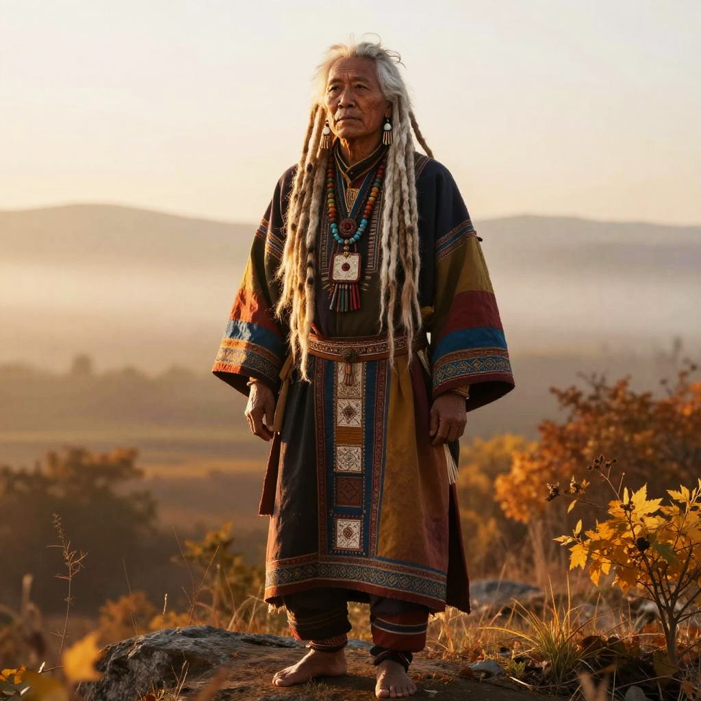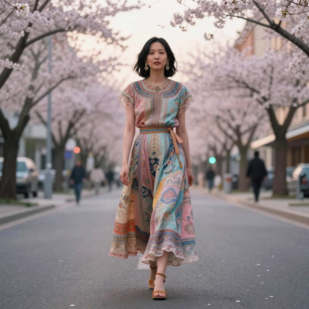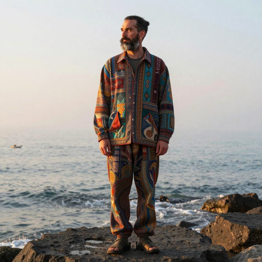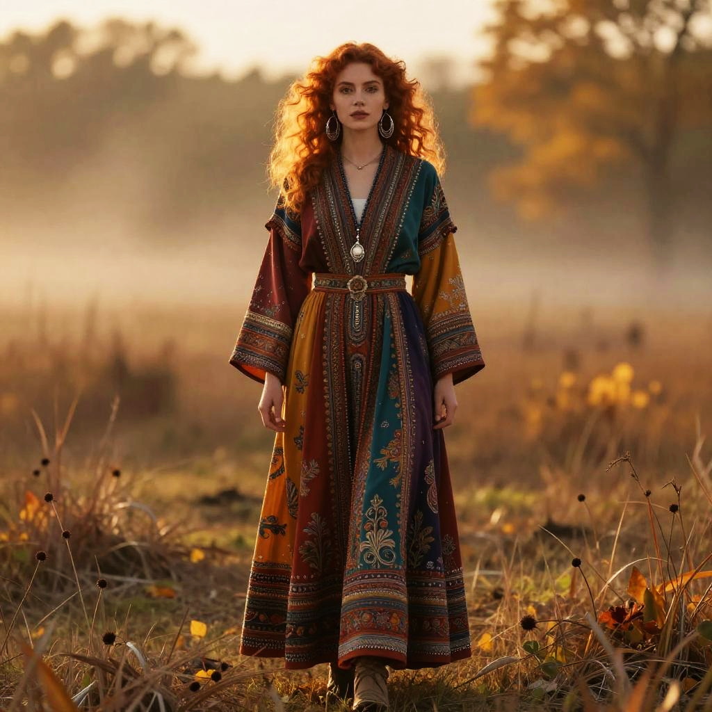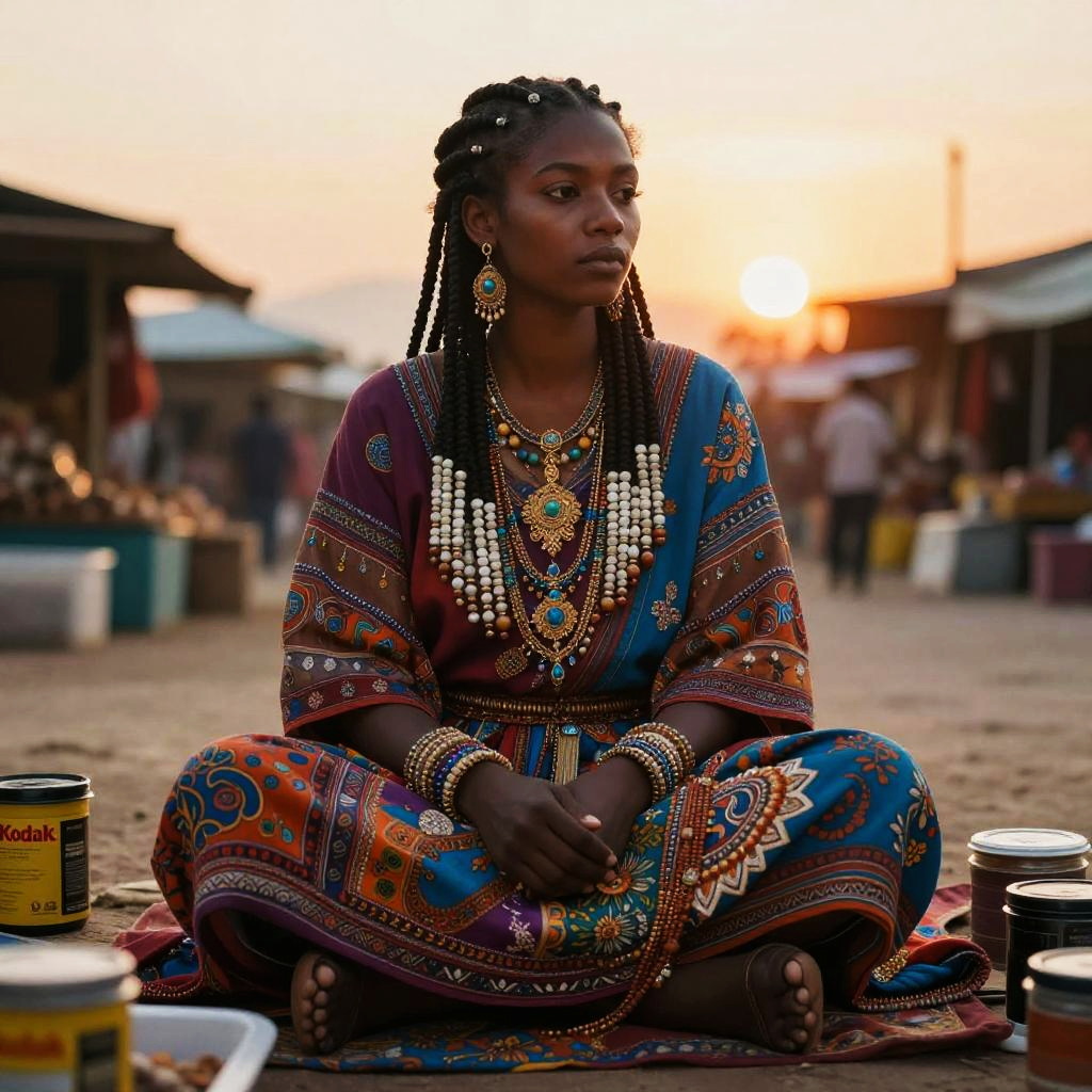 Psychological portrait of a market trader, 28 years old, with tight braids with beads and earrings, full body picture, colorful clothes. Summer, sunset, warm colors, mist, insanely detailed and intricate, hypermaximalist, elegant, ornate, hyper-realistic, 24mm, depth-of-field, Kodak, super detailed.