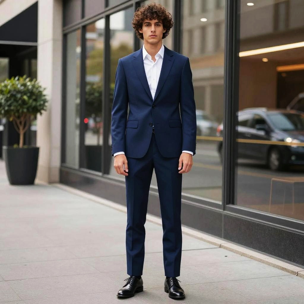 Photograph of a young, curly-haired man in a black suit standing confidently in a bright office with large windows, hands in pockets, laptop on desk