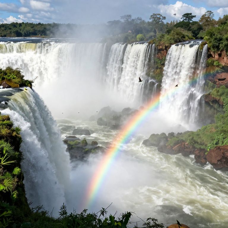 Argentina's Iguazu Falls cascading powerfully surrounded by plush green rainforest, mist rising above, exotic birds flying around, colorful rainbows forming in the spray, a panoramic and breathtaking natural landscape rendered with high detail and vibrant colors.