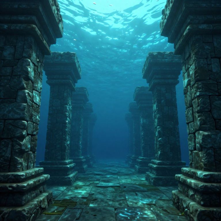 An underwater 3D-rendered scene depicts a hauntingly symmetrical corridor of ancient stone pillars, bathed in ethereal blue-green light filtering through the ocean surface above, creating a surreal and otherworldly atmosphere reminiscent of a forgotten civilization submerged in perfect chronological disarray.