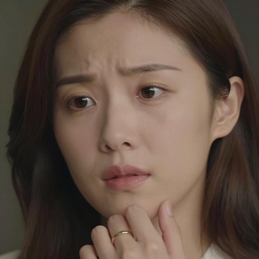 Close-up photograph of a woman with light skin and brown hair. She is looking slightly to the left with a subtle, concerned expression. Her right hand, wearing a simple gold ring on the index finger, is near her chin. Dark background.