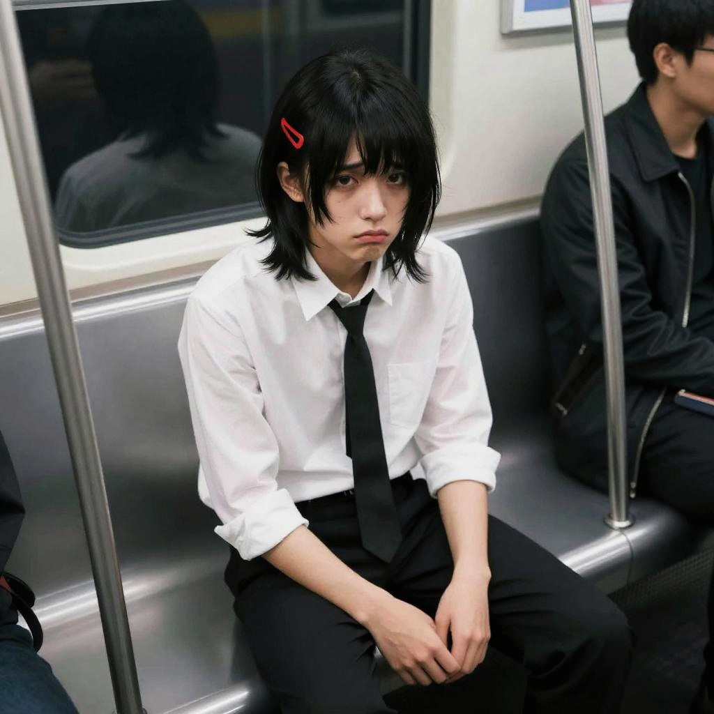 Masterpiece, best quality, ultra-detailed, illustration, epic lighting, cinematic composition, isometric, petite, brown eyes, black hair, swept bangs, single sidelock, red hairclip, white collared shirt, black necktie, black pants, formal, subway, sitting, cowboy shot, looking at viewer, sad, upset, frown, (peace signs), (8k:1.1)