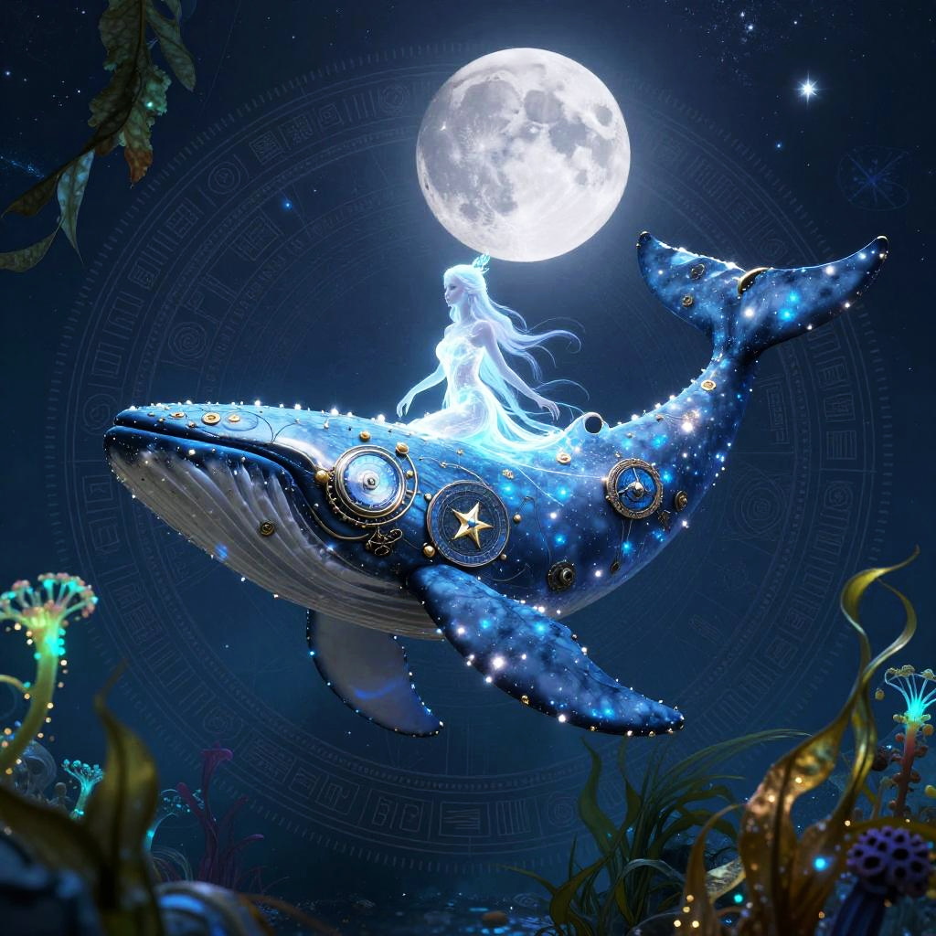 A astral clockwork whale featuring an luminous being set against a backdrop of moonlit bioluminescent kelp sea. Surrounded by intricate patterns and ancient symbols, this scene conveys a sense of wonder, beautifully illuminated to highlight its flawless features.