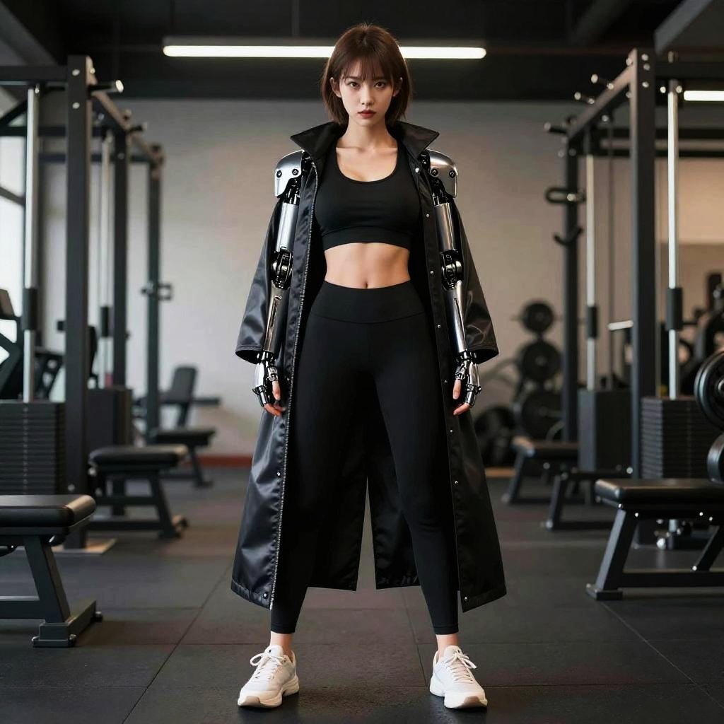 Solo, cyborg, cloak, full shot, full body, akpopgirl, 1girl, wearing black fitness suit, sport shoes, standing in the gym, The focus is on her intense gaze and shiny clothes, looking at camera, in the style of realistic and hyper-detailed renderings