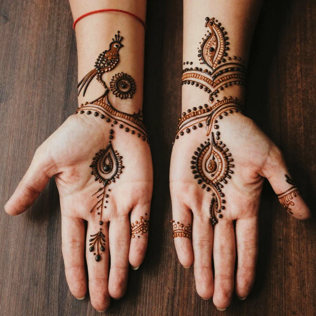 Close-up photograph of two pale hands featuring detailed henna body art with intricate patterns including birds, paisleys, and dots. The palms display symmetrical motifs with a central focal point on each hand. A red string bracelet adorns the left wrist. The background is a dark wooden surface, complementing the traditional design.