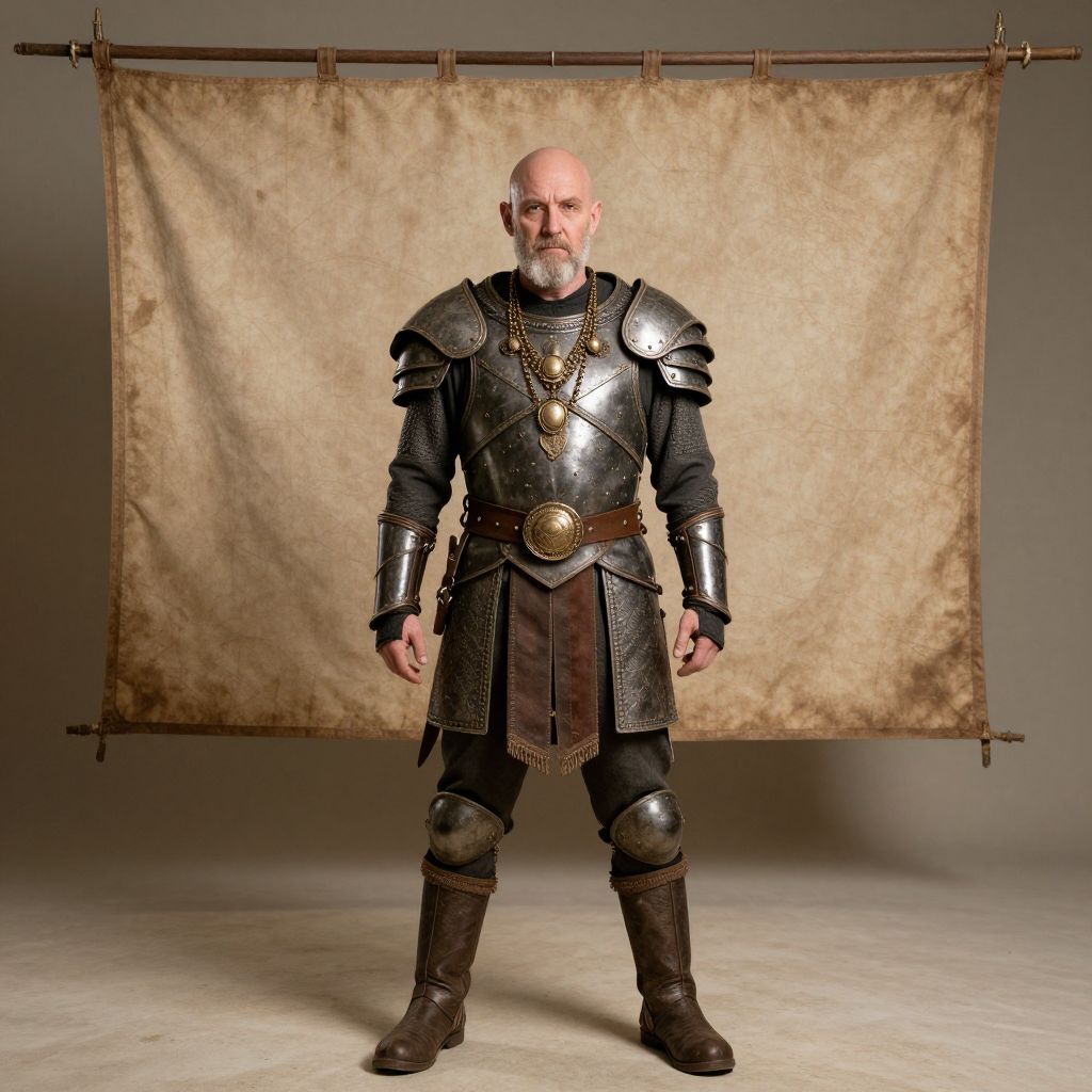 Photograph of a bald, middle-aged man with a white beard standing confidently in front of a beige, slightly wrinkled fabric backdrop. He wears a medieval-style armor set, including a chest plate with a circular bronze emblem, shoulder guards, and a leather skirt with metal accents. His black long-sleeved shirt is tucked into dark brown leather boots with metal knee guards. The armor is shiny, reflecting studio lighting. He stands with his hands by his sides on a gray studio floor, exuding a serious, determined expression. The background is simple, drawing focus to his detailed, historical attire.
