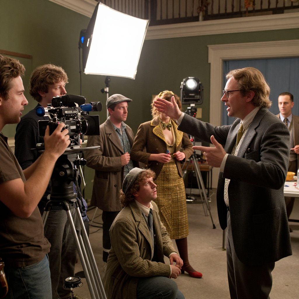 Directing a movie scene on a bustling film set, a focused director gestures passionately amid bright lights and vintage cameras, with crew members adjusting equipment and actors in period costumes ready to perform, cinematic atmosphere, high detail.