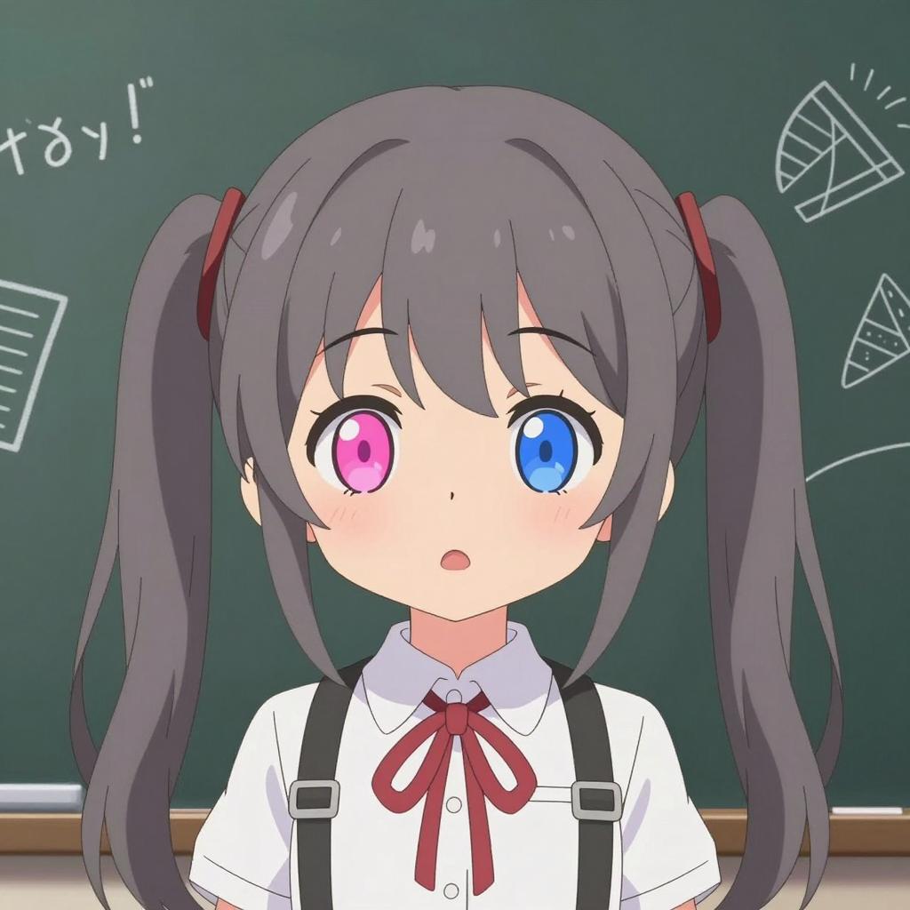 Cute anime chibi girl with twin gray pigtails, heterochromatic eyes with one pink and one blue, wearing a white shirt with black suspender straps and a red ribbon tie, expressive face with slight surprise, standing in front of a dark chalkboard background with white sketches and Japanese text, soft shading, clean lineart, pastel color scheme