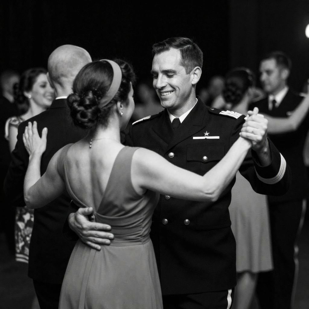 Black-and-white photograph of a dance. Male naval officer in uniform, smiling, dancing with woman in dress and headband. Other couples in background, dancing, smiling. Woman on left, back to camera, in dress, being hugged by bald man. Dark background, dim lighting. Casual, joyful atmosphere.