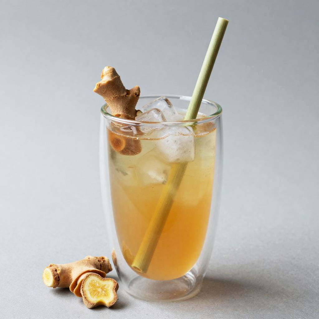 A lemongrass iced tea in a double-walled glass, garnished with candied ginger and lemongrass stalk. This artistic representation features bright colors and a minimalistic design, creating an inviting atmosphere for a refreshing summer drink.