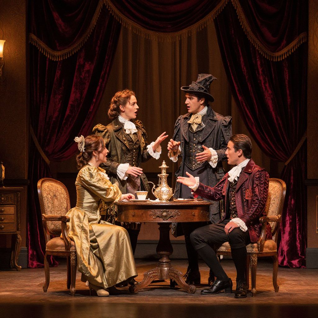 Odrama themed theatrical stage with intricate Victorian costumes, velvet curtains, expressive actors in a heated dialogue, dim warm lighting, dramatic shadows, finely detailed set design with vintage furniture and props.
