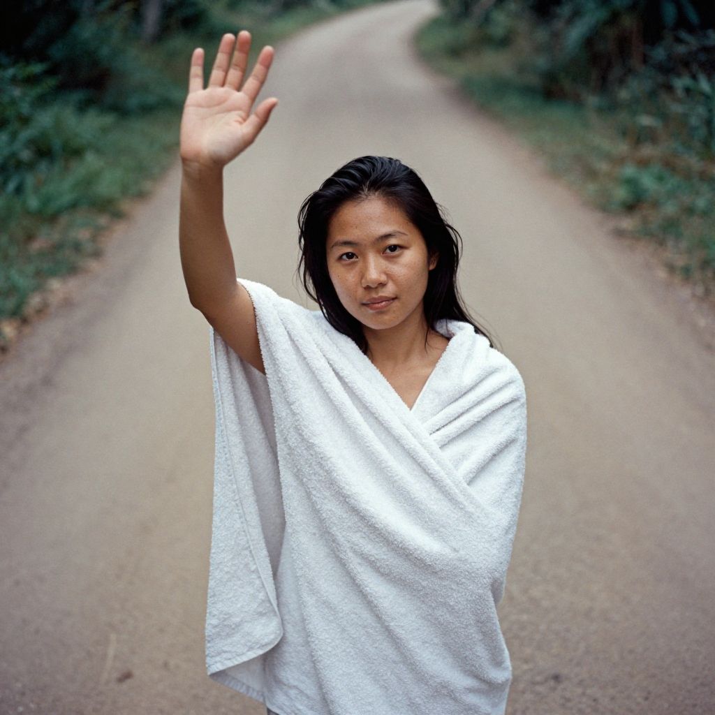 Ell4JoTI, (towel wrap, in towel, dirt road:1.2), waving, one arm wave, style by Dan Winters, RAW photography, film grain, photo taken with a Bolex H16, RAW, color graded portra 400 film, remarkable color, realistic dull skin noise, analog style, highest quality, skin pores, sharp focus, dappled lighting, photographed on a Sony A7R IV, 18mm F/1.7 cine lens
