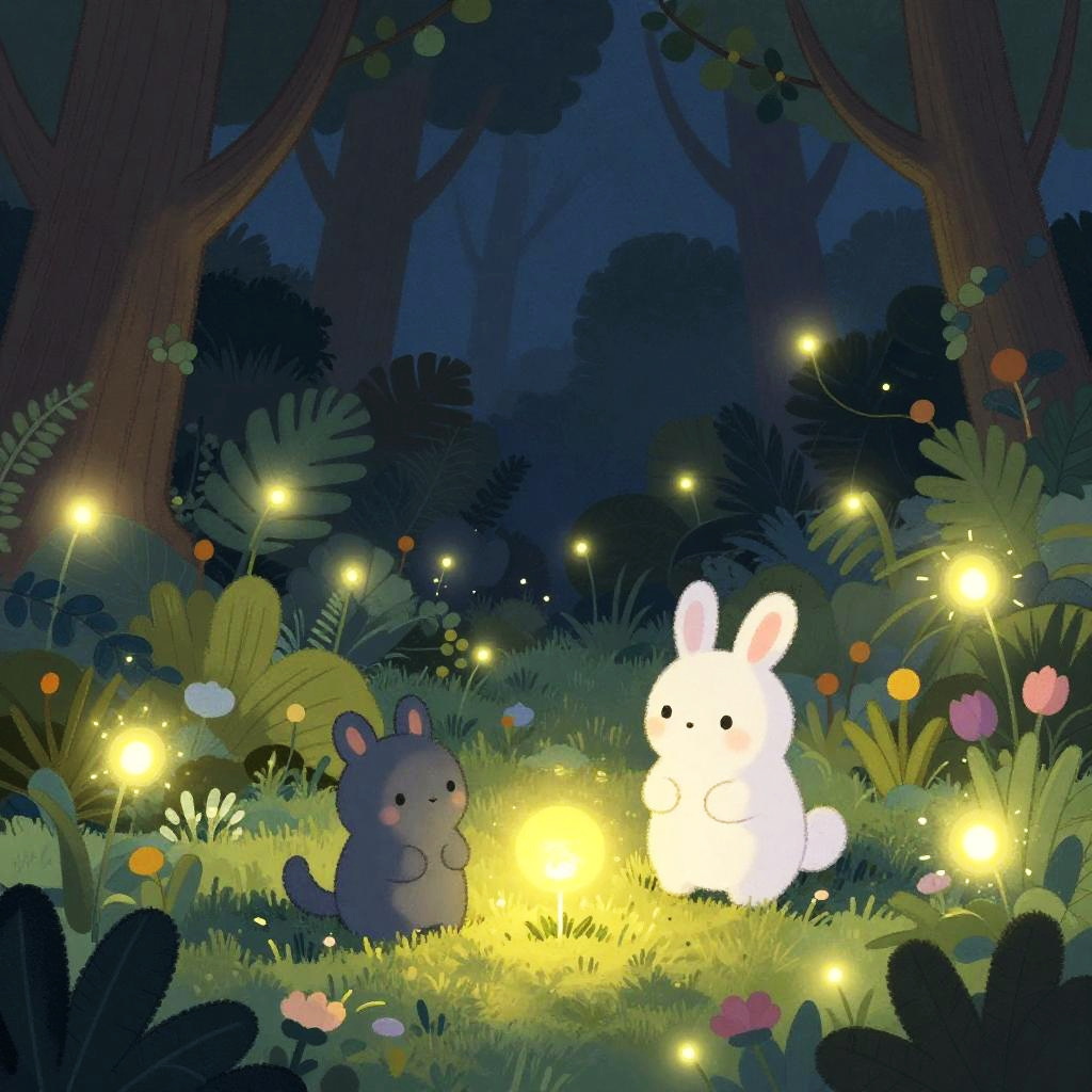 Criaturas forestales pequeñas y juguetonas ocultas entre la flora exuberante y luminiscente, en un claro mágico iluminado por luciérnagas, estilo ilustración infantil con detalles suaves y paleta de colores pastel.