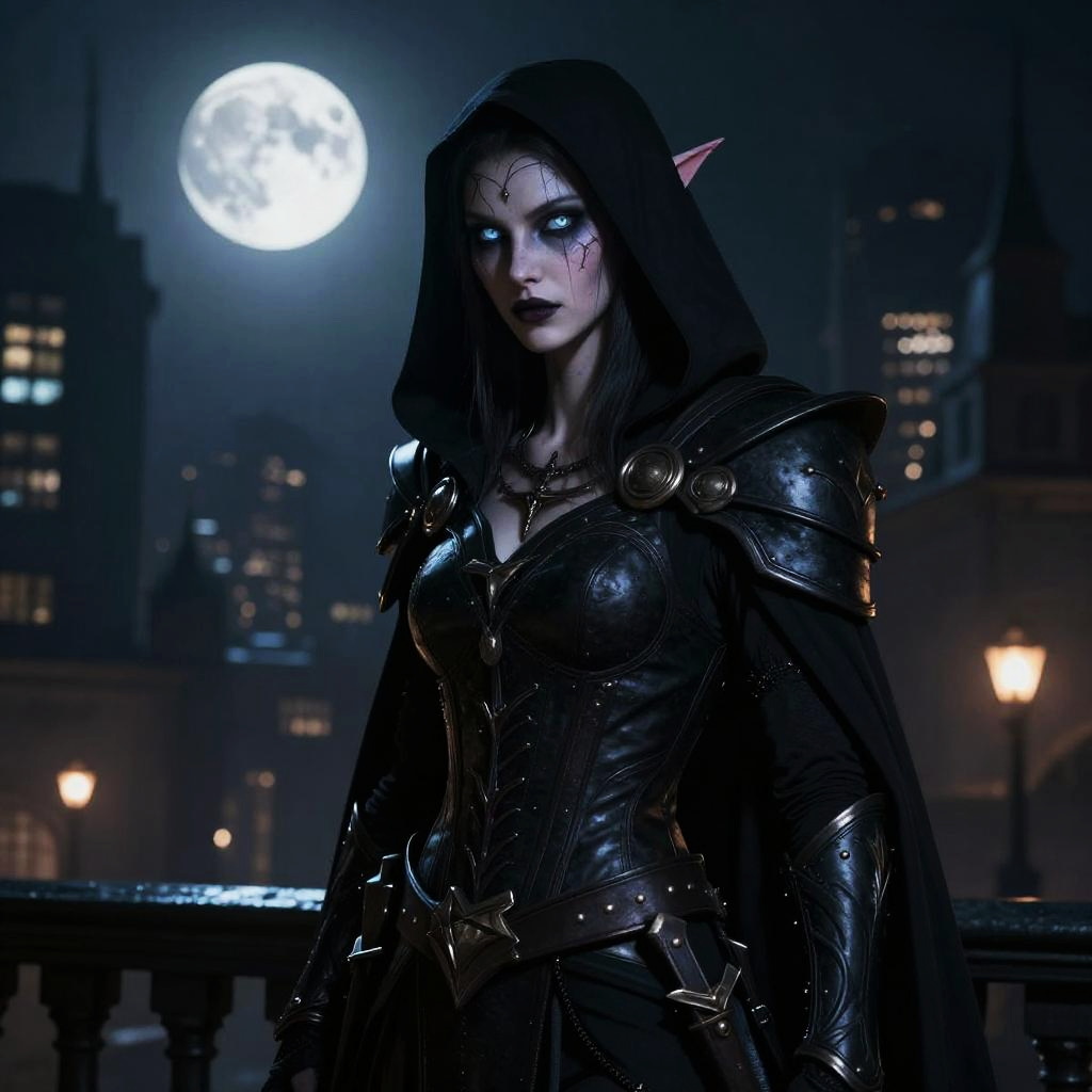 Pathfinder 2e aasimar rogue with subtle celestial features, shadowy cloak blending with moonlit cityscape, piercing eyes glowing faintly, urban fantasy vibe, dramatic and atmospheric