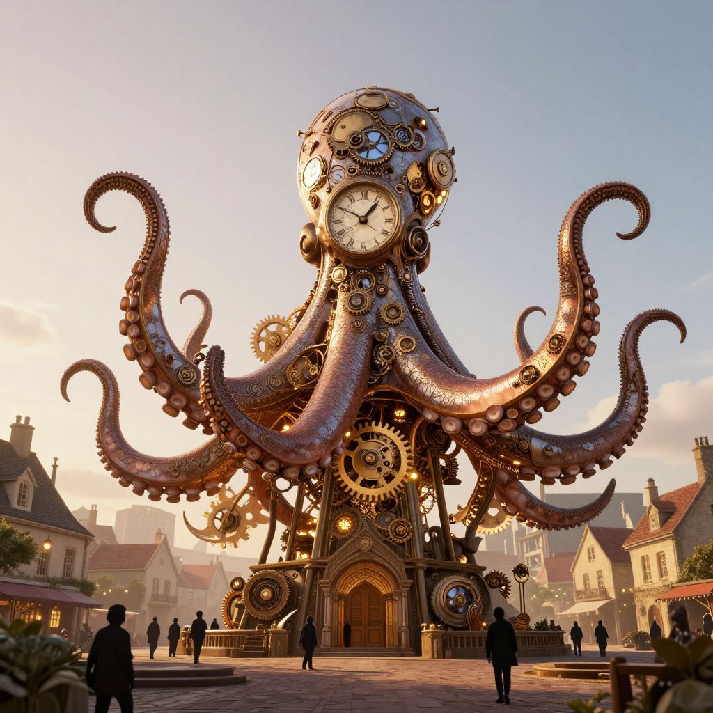 In a surreal, cyberpunk-inspired digital artwork, a colossal clockwork jellyfish with a steampunk aesthetic hovers over a serene desert landscape, its tentacles adorned with intricate gears and cogs, while a child in an orange hoodie stands below, gazing up at this fantastical creature against a backdrop of vibrant blue skies and scattered clouds.