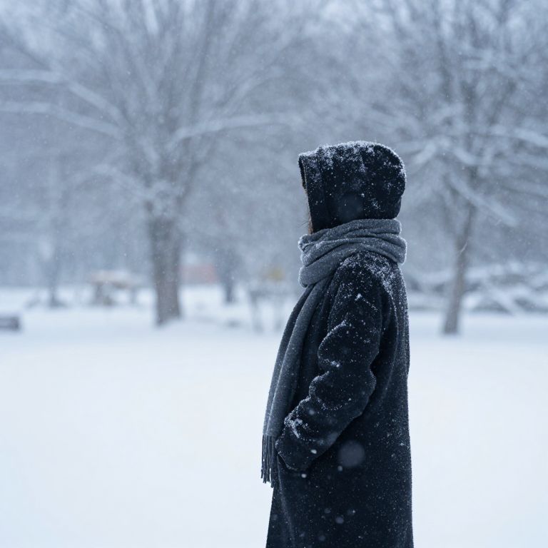 Amidst the quiet embrace of falling snow, a solitary figure stands cloaked in winter's embrace, their back turned to the world, evoking a profound sense of introspection and the transient beauty of solitude.