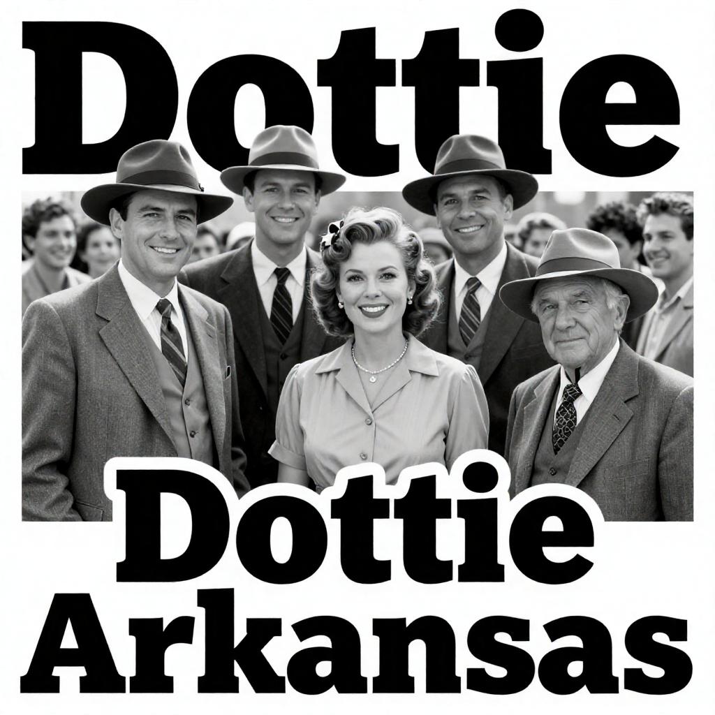 Black-and-white movie poster for "Dottie in Arkansas." Five people: three men in suits with hats, one woman in a dress, one older man in a hat. Bold at top and bottom. Large "Dottie in Arkansas" in center. Crowd in background. Smiling faces. Textured background elements.