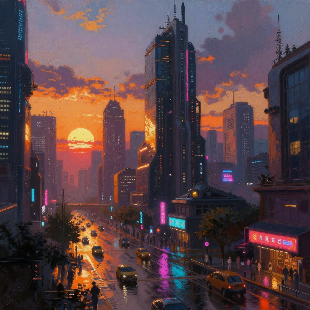 Image style transfer painting of a futuristic cityscape blending impressionist and cyberpunk aesthetics, vibrant colors, glowing neon lights, detailed textures, atmospheric depth, surreal fusion of classic art and modern digital vibes
