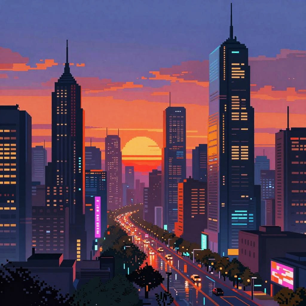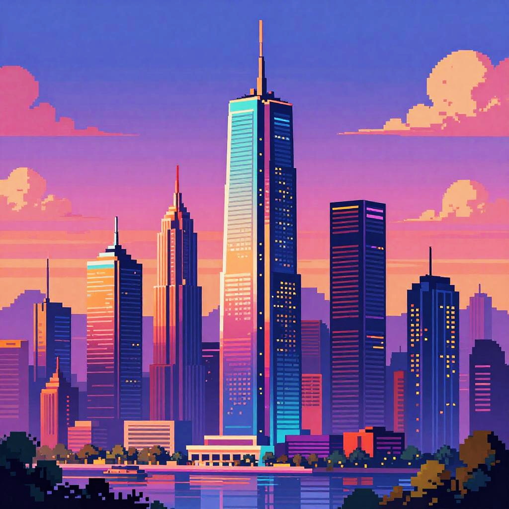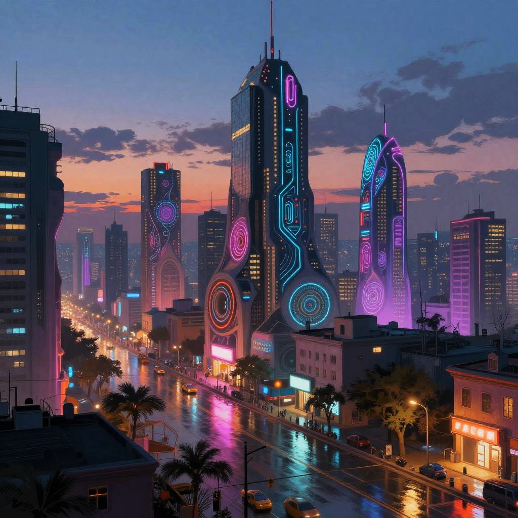 Digital painting of a neon-lit, futuristic city skyline at night, showcasing colorful skyscrapers with vibrant blue, pink, and red lights, illuminated