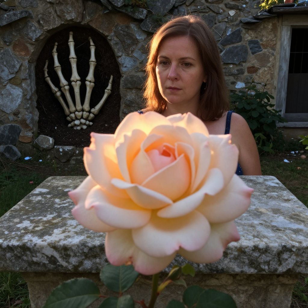 A macro photograph capturing a delicate rose in full bloom atop a stone altar, its petals glowing softly in the golden hour, while in the background, a skeletal hand is partially embedded in the soil, fingers stretched like an ancient warning. The person in the scene is a middle-aged woman with soft brown hair and gentle, thoughtful eyes, standing just behind the flower, her expression focused and contemplative. The setting is a crumbling garden in a forgotten village.. The woman has big tits and cute face