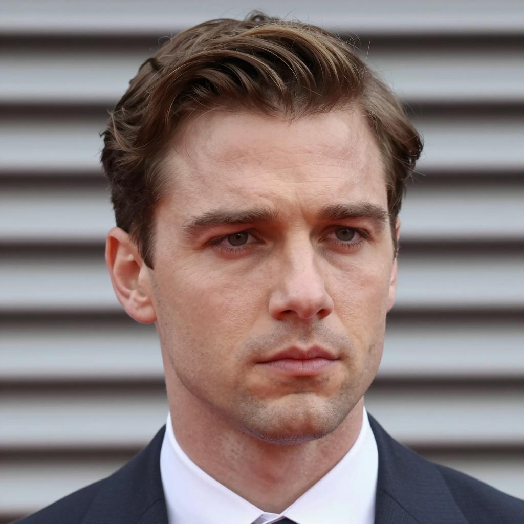 A Caucasian man with fair skin, brown hair in a side part, and light brown eyebrows. He has a focused, slightly intense expression, looking slightly to the right. He wears a dark suit with a white shirt collar. The background is blurred, showing horizontal lines and a neutral color.