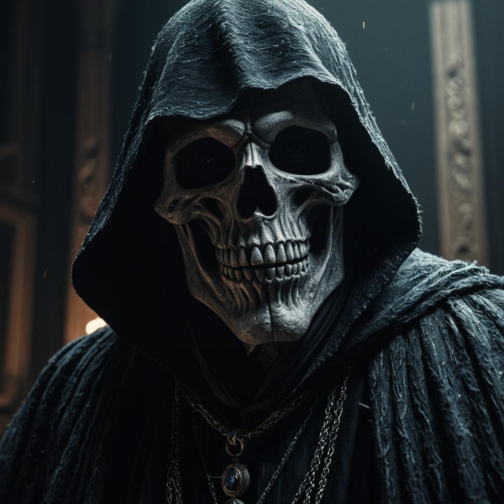 Close-up portrait of a shadow sorcerer figure with a detailed skeletal face wearing a dark, textured hooded robe and a wide-brimmed hat. The design is intricate and surreal, emphasizing bone structure and shadow effects with a moody and dark atmosphere.
