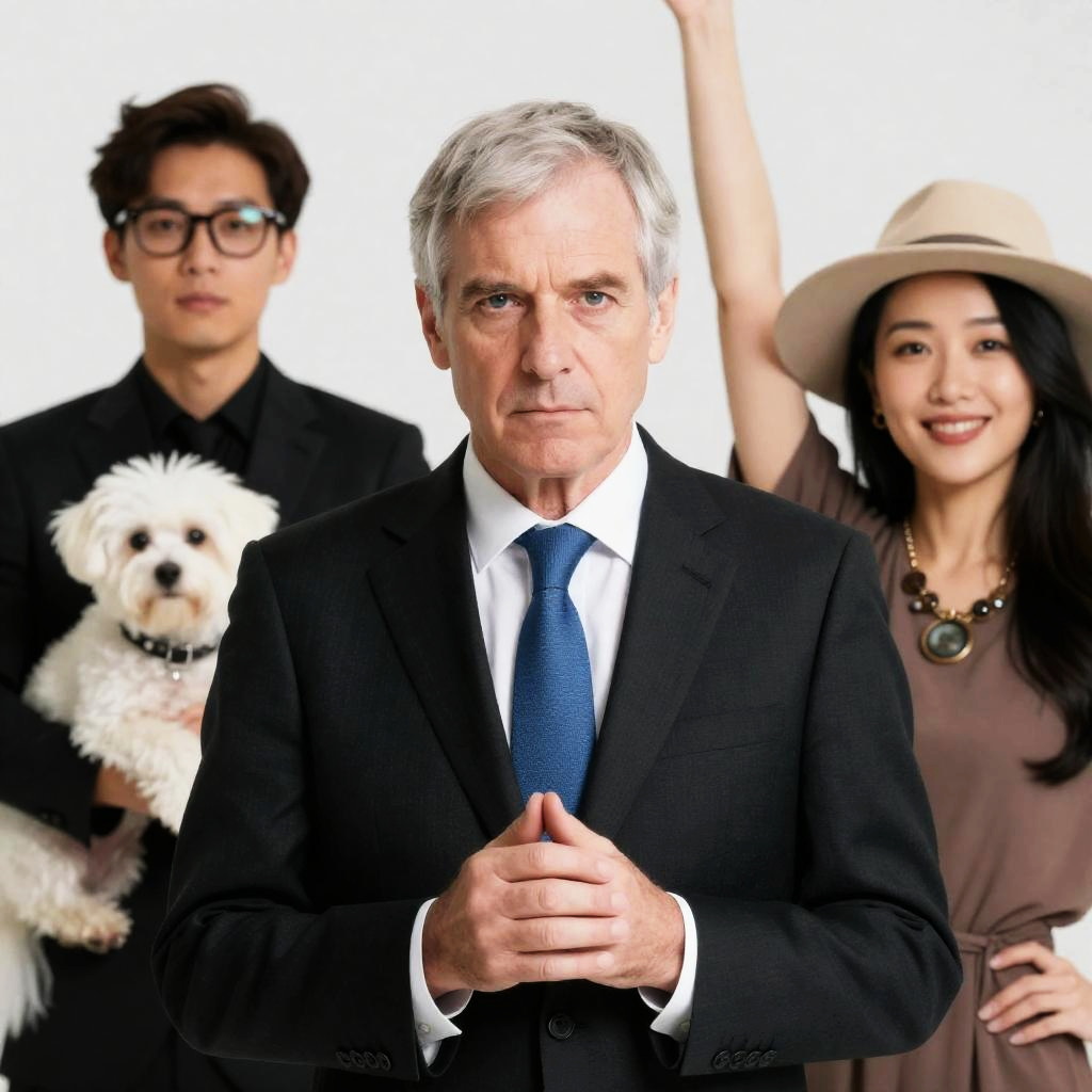 Photograph of a middle-aged white man with gray hair, wearing a black suit, white shirt, and blue tie, standing in the center. He has a serious expression and clasped hands. To his left, a young Asian man with black hair and glasses, dressed in black, holds a small white dog. To his right, an Asian woman with long black hair, wearing a brown dress and a large beige hat, smiles. The background is white, making the subjects stand out. The woman's necklace has a large circular pendant. The image has a bright, clean look with high contrast.
