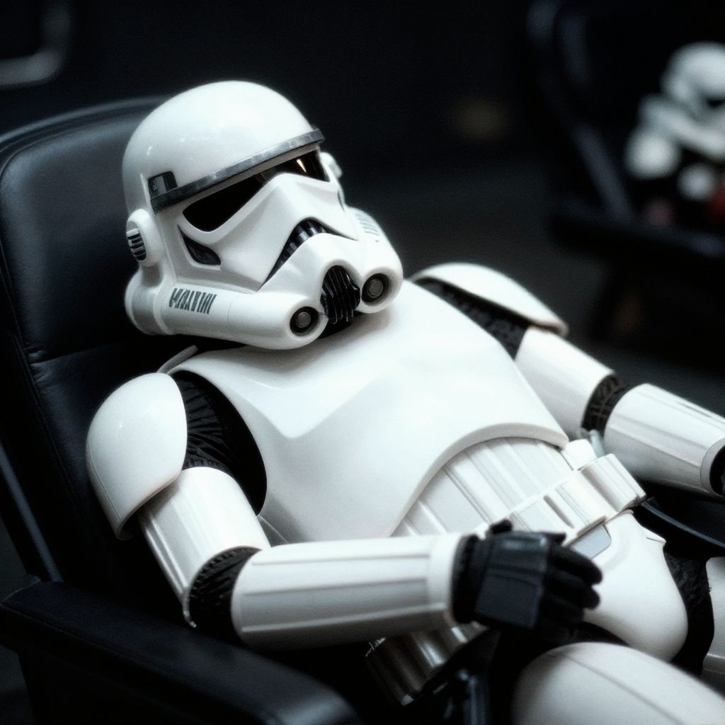 Photograph of a white Stormtrooper suit reclining in a black leather chair, with a relaxed, almost casual posture. High contrast, dark background