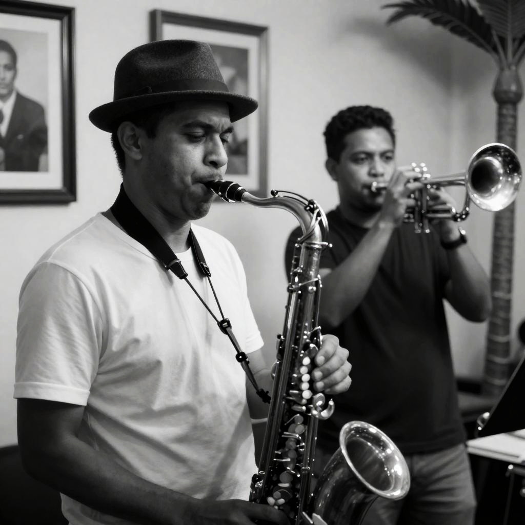 Black and white photograph of two male musicians. One man in the foreground wearing a hat and light shirt, playing a saxophone. The other man in the background wearing dark clothes, playing a trumpet. Both have intense expressions. Background includes framed pictures and a palm tree decoration. Shadows cast on the wall. The saxophonist is slightly turned away, while the trumpeter faces forward.