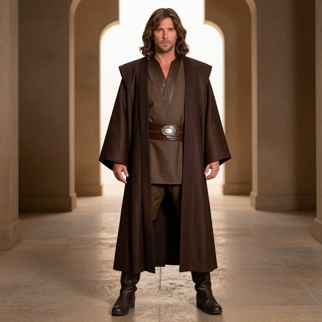 Obi Wan Kenobi Costume Adult, man dressed in a robe and boots standing in a hallway
