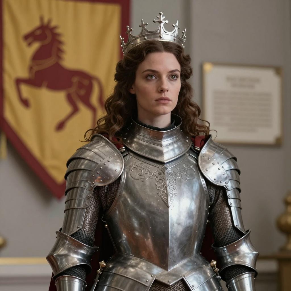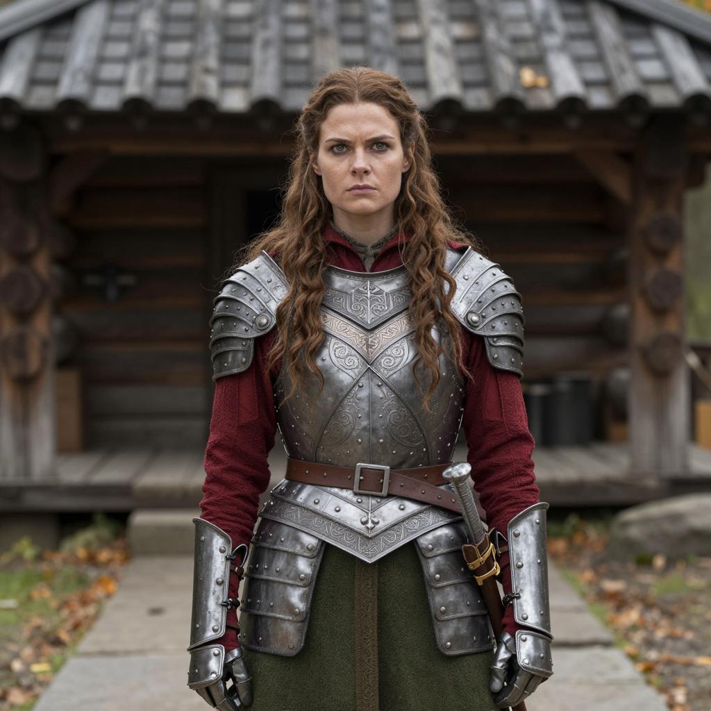 Druig eternals costume, photorealistic, young female warrior, Viking-inspired armor, detailed silver helmet with horns, focused expression, brown leather tunic, red scarf, intricate shoulder plates, brown sash, blurred background with other warriors, realistic lighting, fantasy setting, fantasy armor, high detail, medieval warrior, serious mood, close-up, realistic ures, medieval fantasy, strong female character, focused gaze, Viking attire, historical fantasy, intense look, serious atmosphere, detailed costume design, realistic color palette
